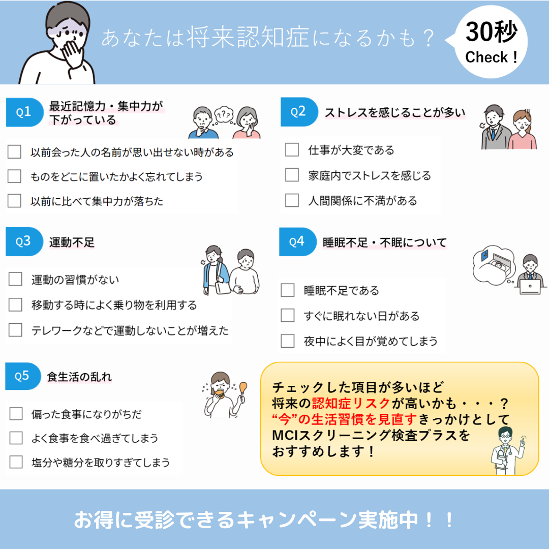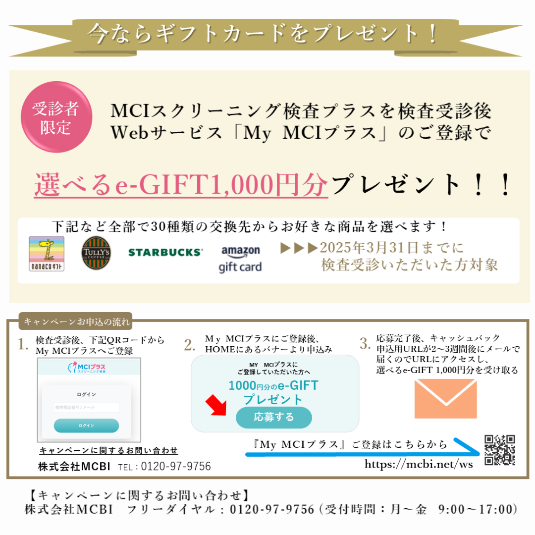 チェックリストにはどれくらい当てはまる項目がございましたでしょうか? 当施設では、MCIスクリーニング検査は人間ドックのオプション検査として税込22,000円でご案内しております。 令和7年3月末までは、検査後に「My MCIプラス」のご登録をしていただくと30種類の中から選択できるe-Gift 1,000円分をプレゼントしております。 高くてなかなか踏み出せない・・・という方も、お得な機会に検査してみませんか? こちらにも検査の内容を記載しております。ぜひご確認ください!