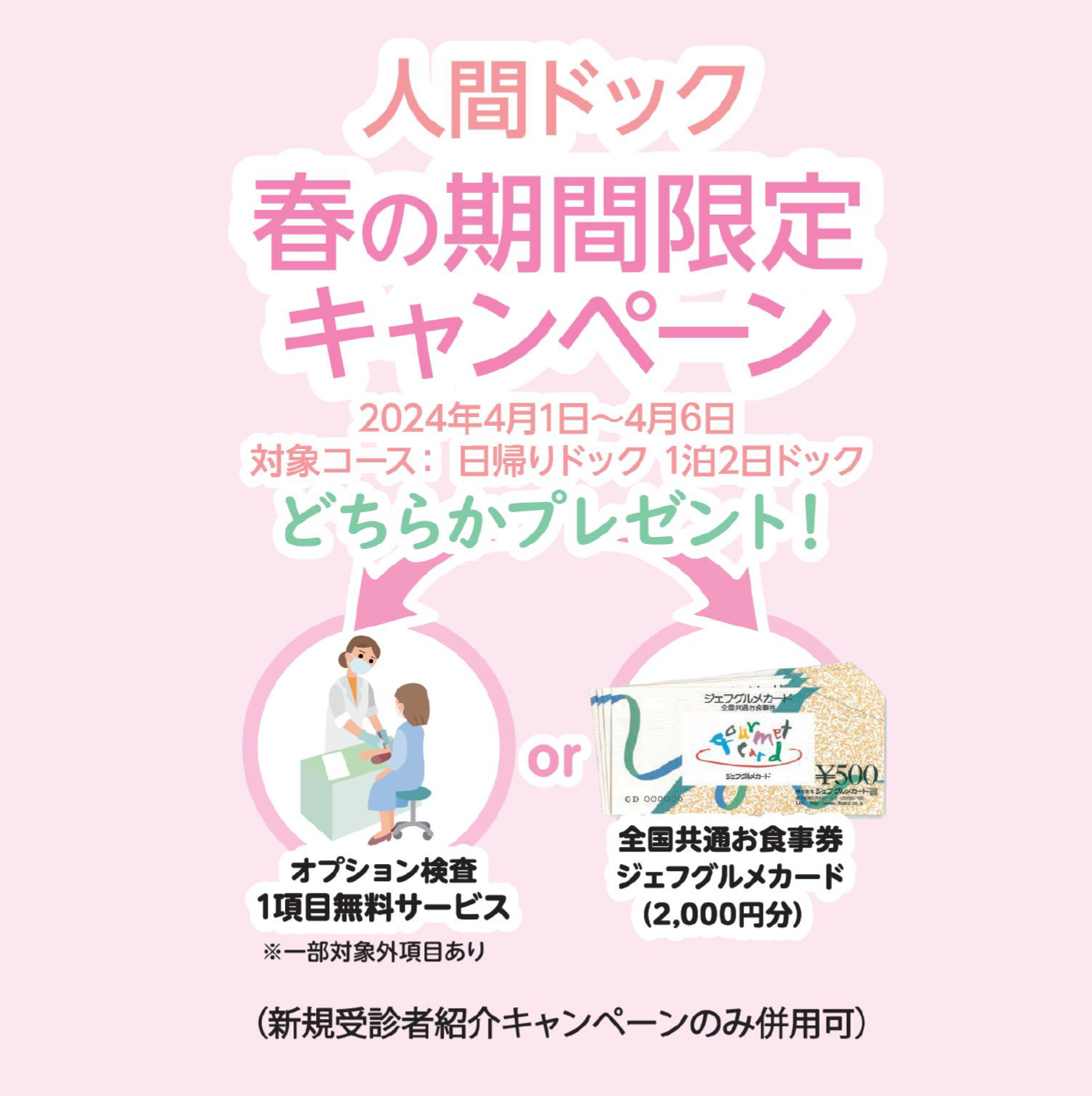 令和6年4月1日~4月6日の期間限定キャンペーンをご紹介します。 期間内に日帰りドックもしくは1泊2日ドック受診の方には特典をご用意しております。 お得な機会にぜひご利用ください。