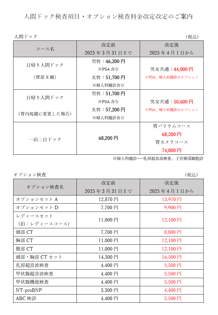 【人間ドック・オプション検査料金の改定日】2025年4月1日より