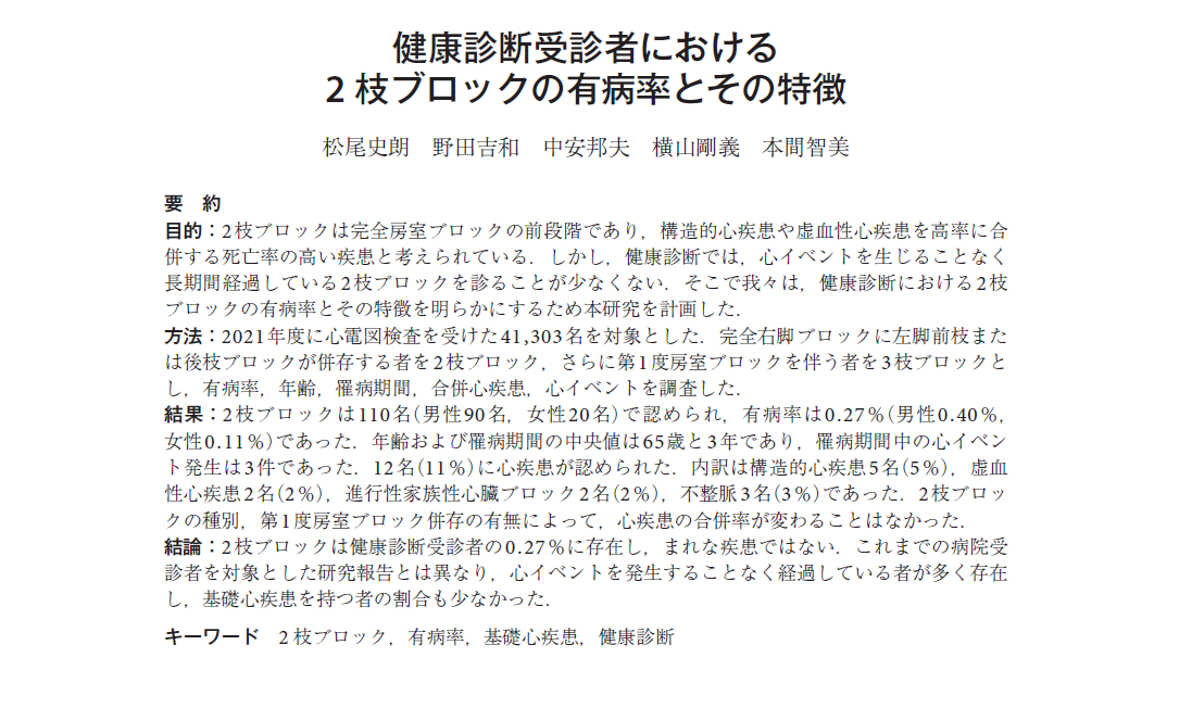 受賞論文: 健康診断受診者における2枝ブロックの有病率とその特徴