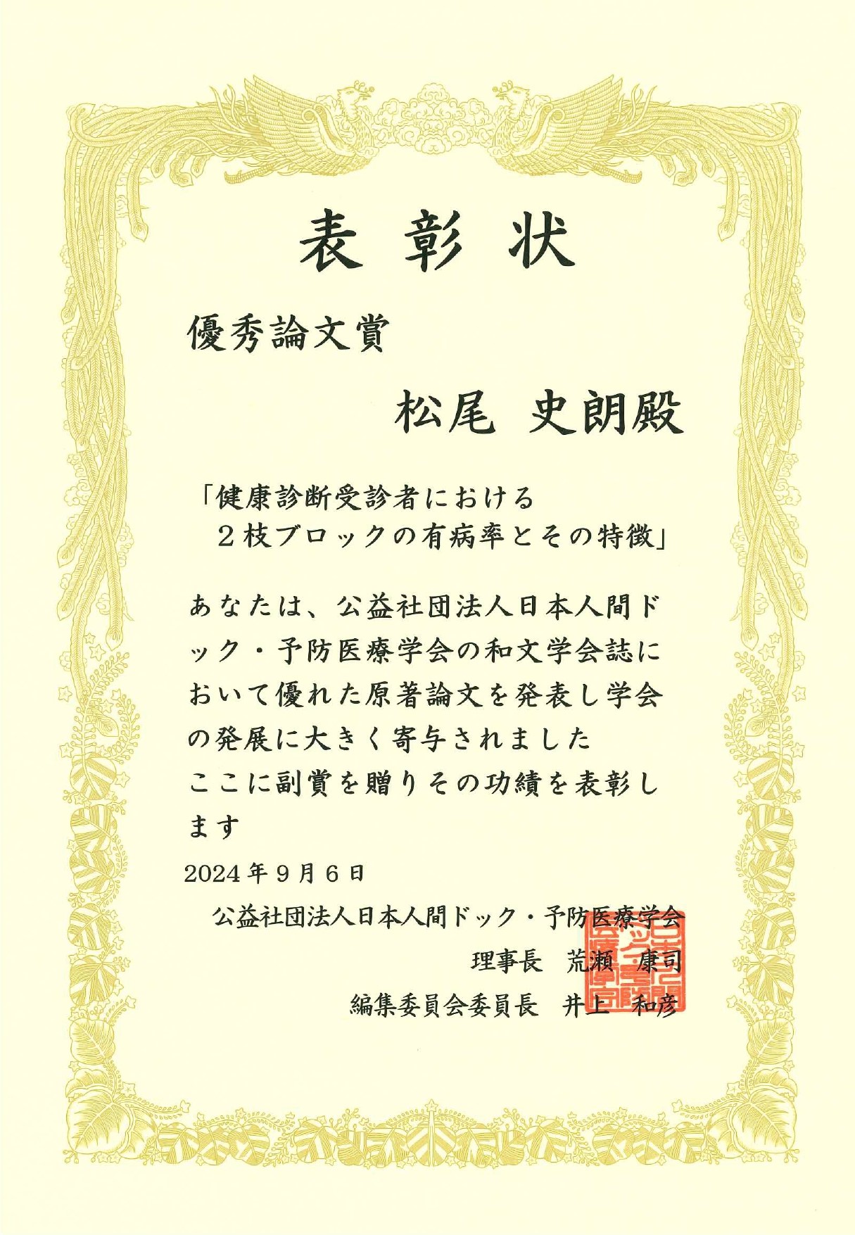 令和6年9月6日(金)~7日(土)にパシフィコ横浜で開催された、第65回日本人間ドック・予防医療学会学術大会にて、当センター医師 松尾 史朗が学会誌掲載論文の中から優秀論文賞を受賞しました。