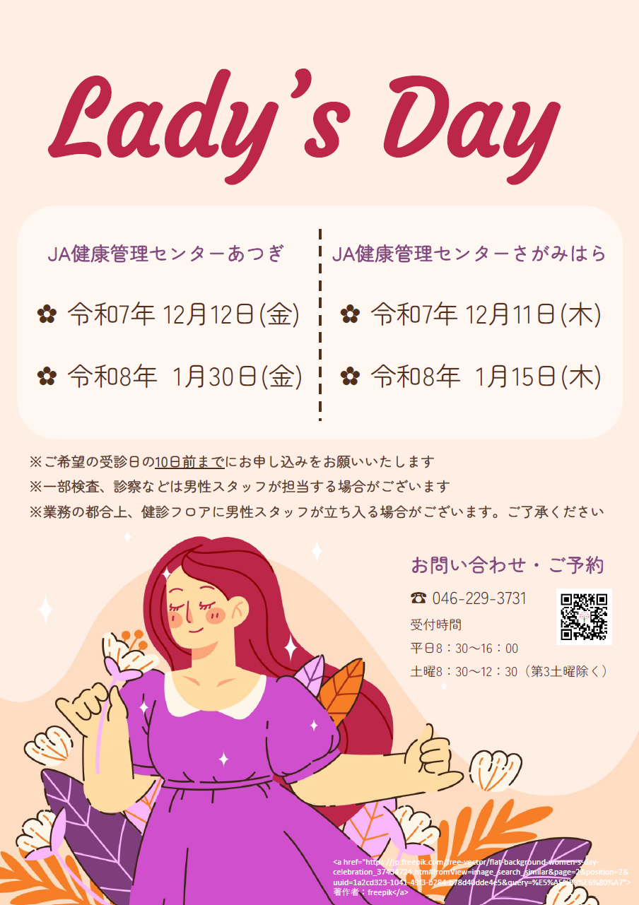 当院では、受診者を女性に限定しているレディースデーをご用意しております。 女性だけの空間でリラックスして検査を受けたい方はぜひご利用ください。 なお、一部検査、診察などは男性スタッフが対応する場合がございます。 業務の都合上、健診フロアに男性スタッフが立ち入る場合もございますので予めご承知おきください。